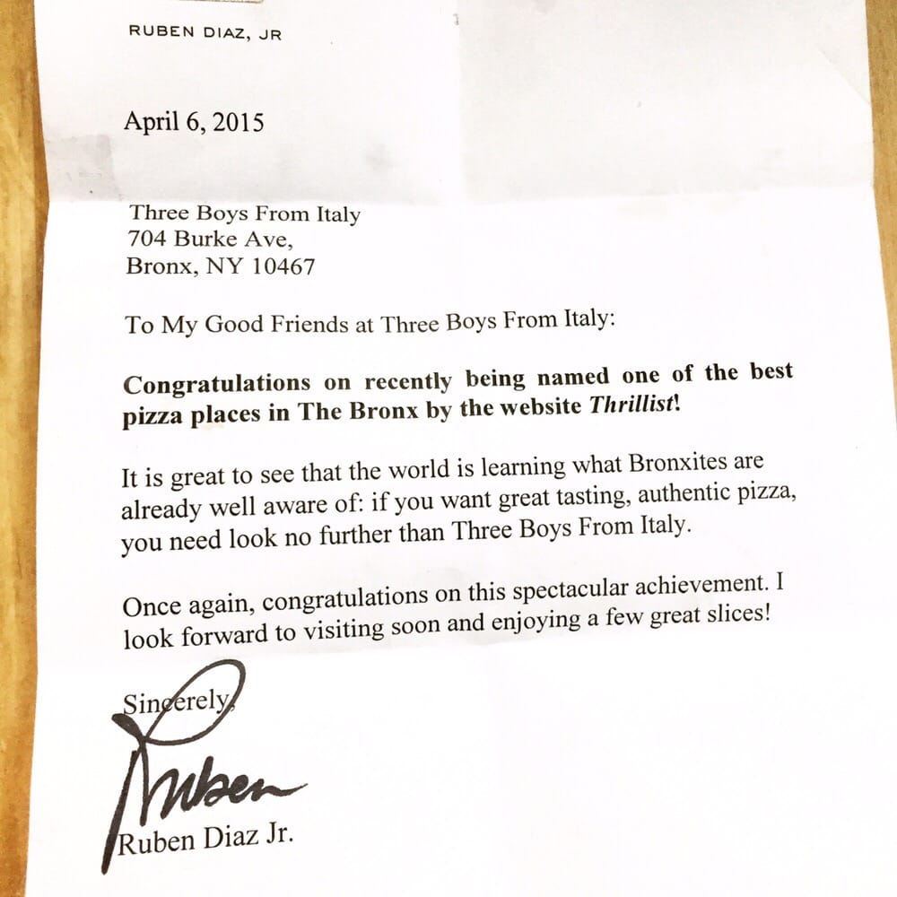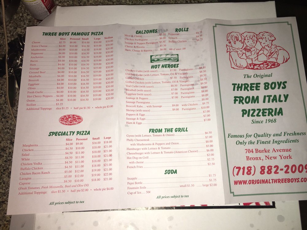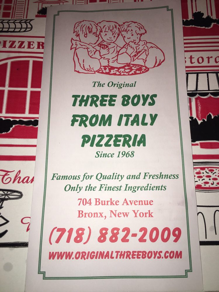Introducing Three Boys From Italy, a long-standing family-owned pizzeria in the Bronx, NY, known for its delicious and authentic Italian pizza. With a history dating back to 1968, this pizzeria has stood the test of time, offering a variety of menu options including heroes and pasta at affordable prices. Customers rave about the flavorful pizza, with reviews like "BEST PIZZA EVER IN ALL OF NEW YORK!!!" highlighting the quality and taste of the dishes. The establishment also offers a casual dining experience, with options for takeout, delivery, and outdoor seating. Whether you're craving a classic slice of pizza or a hearty pasta dish, Three Boys From Italy is a must-visit for pizza lovers in the area.
